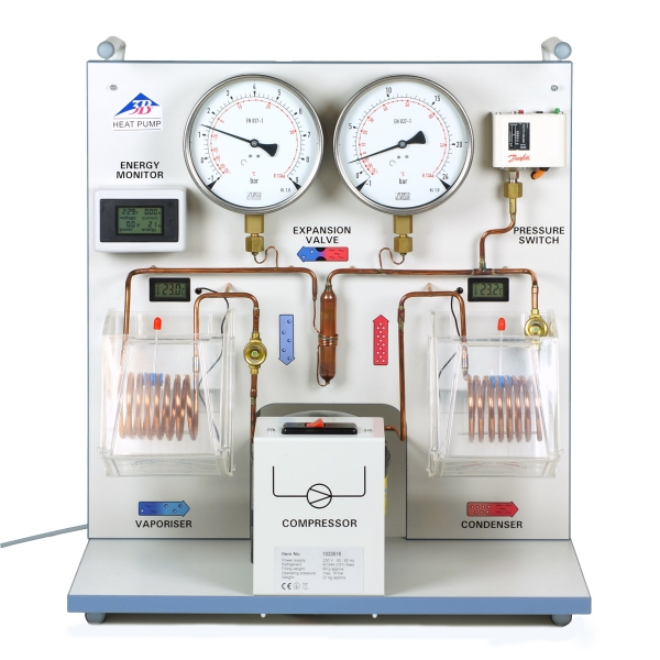 Die Komponenten sind durch Kupferrohr zu einem geschlossenen System verbunden auf einem Grundbrett aufgebaut und können dank der übersichtlichen Anordnung unmittelbar mit der Abfolge der Zustandsänderungen im Kreisprozess der Wärmepumpe in Verbindung gebracht werden.