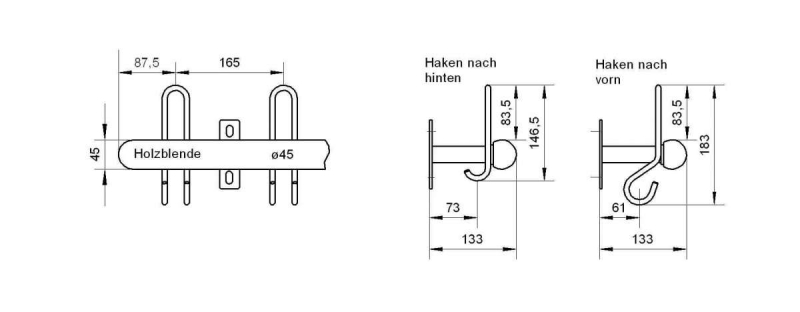 * Es werden Dreifachhaken bestehend aus je 1 Bügel/Huthaken und 2 Garderobenhaken verwendet. Die Anzahl der Dreifachhaken enspricht somit der Anzahl Bügel!