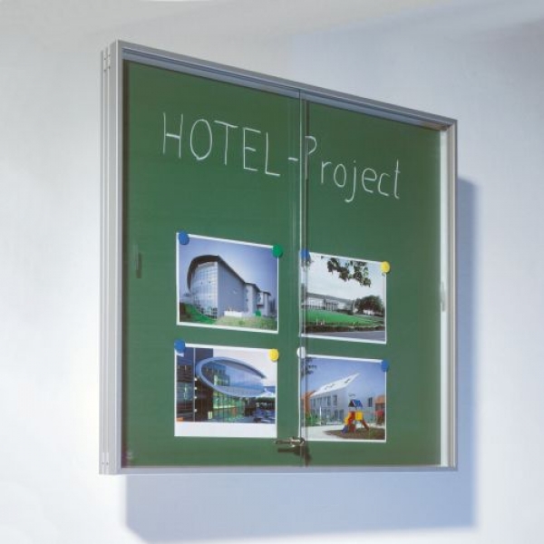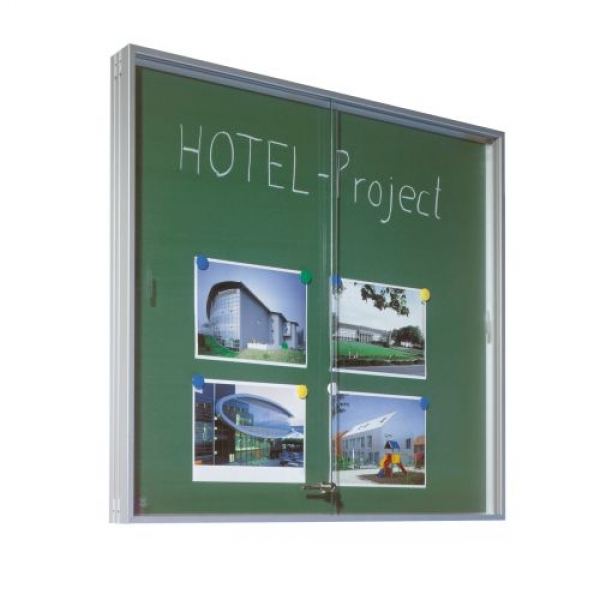 Unsere Wandvitrine für den Innenbereich mit Aluminiumprofilrahmen und grüner Stahlrückwand, ist mit Kreide beschreibbar, feucht abwischbar und magnethaftend. Sie kann in 3 verschiedenen Größen bestellt werden. Die Schiebetür ist aus Sicherheitsglas gefertigt und abschließbar.