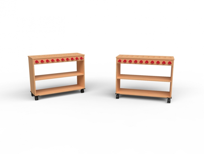 Waschraumwagen, fahrbarBxHxT 100 x 80 x 35 cm offen, 1 Ablageboden, 2 x 10 2-fach Kunststoffhakensowie 2 x 10 Bohrungen für Zahnputzbecher geeignet für bis zu 20 Kinder4 Rollen, 2 davon feststellbar