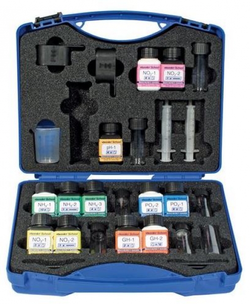 Er kann zur Bestimmung folgender Wasserparameter benutzt werden: Ammonium, Nitrat, Nitrit, Phosphat, pH-Wert und Gesamthärte und reicht für mindestens 50 Untersuchungen.