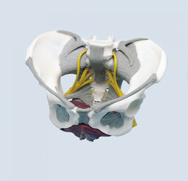 Beckenmodell wie 4070, jedoch mit Darstellung des Bandapparates, der Nerven und einer herausnehmbaren, zweiteiligen Beckenbodenmuskulatur. Größe: 27 x 18 x 19 cm