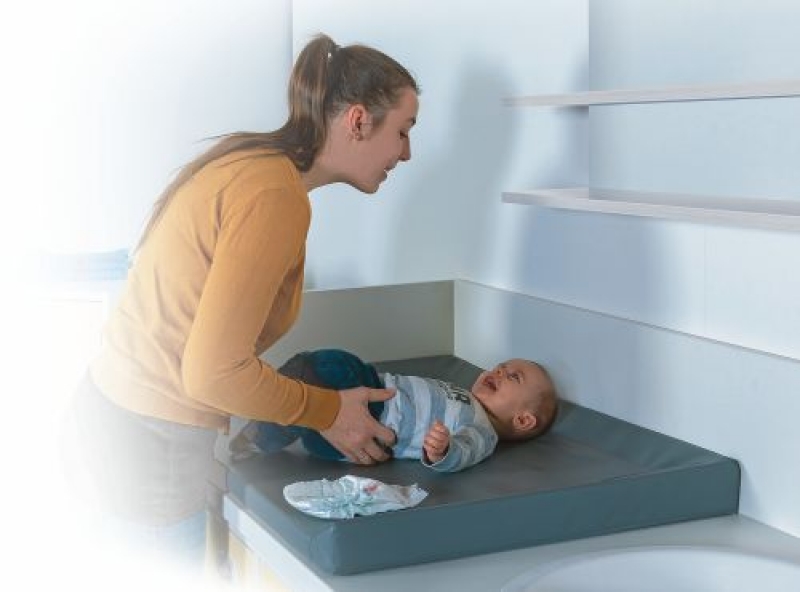 Wickelauflage mit Schaumstoffkern und dreiseitiger keilförmiger Erhöhung. Der Kunstlederbezug ist in diversen Farben erhältlich.
