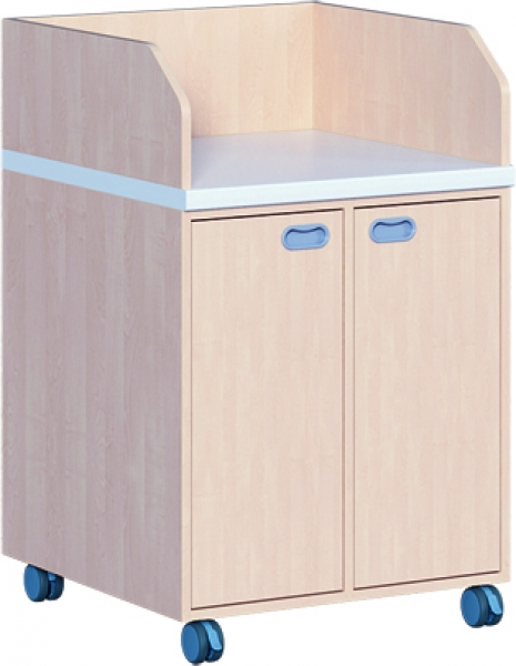 fahrbares Wickelcenter BxHxT 80,1 x 85 / 110 x 75 cm oben: 3-seitige Wickelumrandung vorne: 2 Türen, nicht abschließbar, Muschelgriffe, Mittelwand, 2 x 3 Fachböden seitlich: 1 Tür, Segmentbogengriff ( RM 128 mm ) verchromt matt 4 Rollen, 2 davon feststellbar - OHNE Wickelauflage