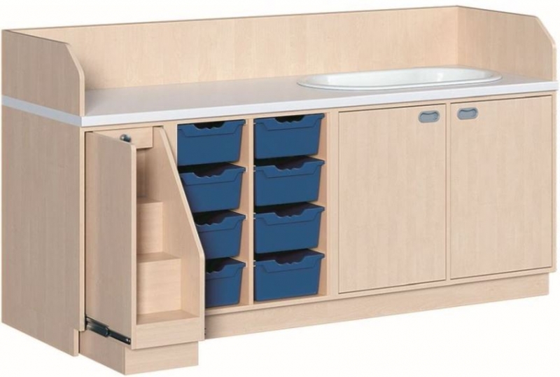 Ob als einzeln aufgestellter Wickelschrank oder als große Wickelkombination - in jedem Fall bieten die verschiedenen Elemente der Wickelkommoden langlebige Materialien, geprüfte Sicherheit, ergonomische Maße und zudem viel Stauraum. Dreiseitige Sicherheits-Aufkantungen umranden die Arbeitsplatte, welche wasserfest beschichtet und vorn benutzerfreundlich gerundet ist. Eingelassene Griffe und der zurückgesetzte Sockel gestatten ein nahes Herantreten an den Wickelplatz. Als Ausstattungen sind verschiedene Varianten rückenschonender Aufstiegshilfen, Schübe, sowie Kinderbadewannen und Handwaschbecken erhältlich. Optional ist eine besonders wasserfeste Sockelvariante lieferbar. Es kann zwischen zwei verschiedenen Arbeitstiefen und Rechts/Links-Varianten der Schränke gewählt werden. Die Wickelauflage ist separat zu bestellen.