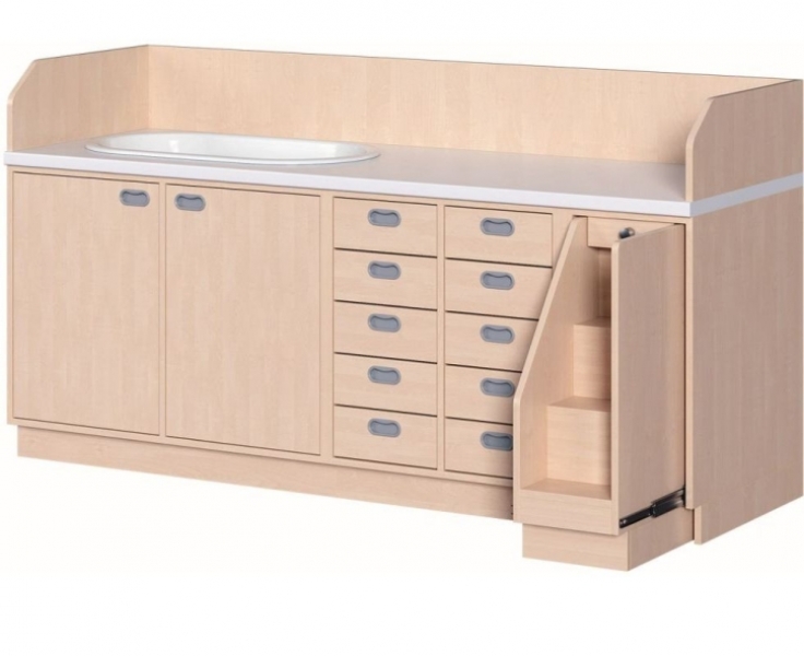 Ob als einzeln aufgestellter Wickelschrank oder als große Wickelkombination - in jedem Fall bieten die verschiedenen Elemente der Wickelkommoden langlebige Materialien, geprüfte Sicherheit, ergonomische Maße und zudem viel Stauraum. Dreiseitige Sicherheits-Aufkantungen umranden die Arbeitsplatte, welche wasserfest beschichtet und vorn benutzerfreundlich gerundet ist. Eingelassene Griffe und der zurückgesetzte Sockel gestatten ein nahes Herantreten an den Wickelplatz. Als Ausstattungen sind verschiedene Varianten rückenschonender Aufstiegshilfen, Schübe, sowie Kinderbadewannen und Handwaschbecken erhältlich. Optional ist eine besonders wasserfeste Sockelvariante lieferbar. Es kann zwischen zwei verschiedenen Arbeitstiefen und Rechts/Links-Varianten der Schränke gewählt werden. Die Wickelauflage ist separat zu bestellen.