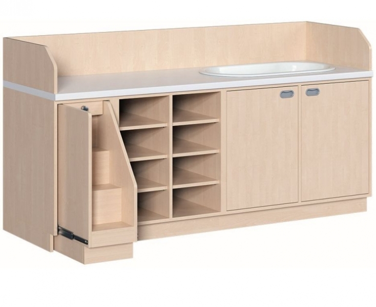 Ob als einzeln aufgestellter Wickelschrank oder als große Wickelkombination - in jedem Fall bieten die verschiedenen Elemente der Wickelkommoden langlebige Materialien, geprüfte Sicherheit, ergonomische Maße und zudem viel Stauraum. Dreiseitige Sicherheits-Aufkantungen umranden die Arbeitsplatte, welche wasserfest beschichtet und vorn benutzerfreundlich gerundet ist. Eingelassene Griffe und der zurückgesetzte Sockel gestatten ein nahes Herantreten an den Wickelplatz. Als Ausstattungen sind verschiedene Varianten rückenschonender Aufstiegshilfen, Schübe, sowie Kinderbadewannen und Handwaschbecken erhältlich. Optional ist eine besonders wasserfeste Sockelvariante lieferbar. Es kann zwischen zwei verschiedenen Arbeitstiefen und Rechts/Links-Varianten der Schränke gewählt werden. Die Wickelauflage ist separat zu bestellen.