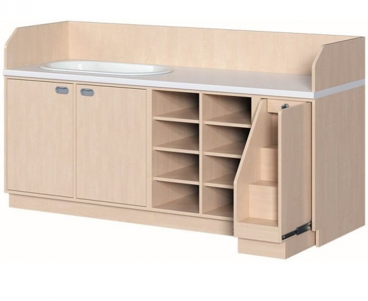 Ob als einzeln aufgestellter Wickelschrank oder als große Wickelkombination - in jedem Fall bieten die verschiedenen Elemente der Wickelkommoden langlebige Materialien, geprüfte Sicherheit, ergonomische Maße und zudem viel Stauraum. Dreiseitige Sicherheits-Aufkantungen umranden die Arbeitsplatte, welche wasserfest beschichtet und vorn benutzerfreundlich gerundet ist. Eingelassene Griffe und der zurückgesetzte Sockel gestatten ein nahes Herantreten an den Wickelplatz. Als Ausstattungen sind verschiedene Varianten rückenschonender Aufstiegshilfen, Schübe, sowie Kinderbadewannen und Handwaschbecken erhältlich. Optional ist eine besonders wasserfeste Sockelvariante lieferbar. Es kann zwischen zwei verschiedenen Arbeitstiefen und Rechts/Links-Varianten der Schränke gewählt werden. Die Wickelauflage ist separat zu bestellen.