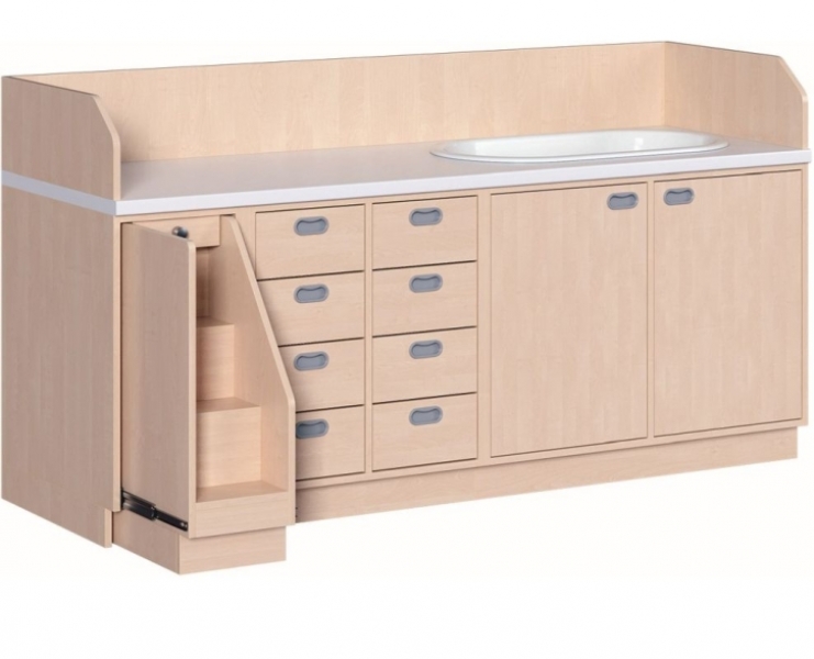 Ob als einzeln aufgestellter Wickelschrank oder als große Wickelkombination - in jedem Fall bieten die verschiedenen Elemente der Wickelkommoden langlebige Materialien, geprüfte Sicherheit, ergonomische Maße und zudem viel Stauraum. Dreiseitige Sicherheits-Aufkantungen umranden die Arbeitsplatte, welche wasserfest beschichtet und vorn benutzerfreundlich gerundet ist. Eingelassene Griffe und der zurückgesetzte Sockel gestatten ein nahes Herantreten an den Wickelplatz. Als Ausstattungen sind verschiedene Varianten rückenschonender Aufstiegshilfen, Schübe, sowie Kinderbadewannen und Handwaschbecken erhältlich. Optional ist eine besonders wasserfeste Sockelvariante lieferbar. Es kann zwischen zwei verschiedenen Arbeitstiefen und Rechts/Links-Varianten der Schränke gewählt werden. Die Wickelauflage ist separat zu bestellen.