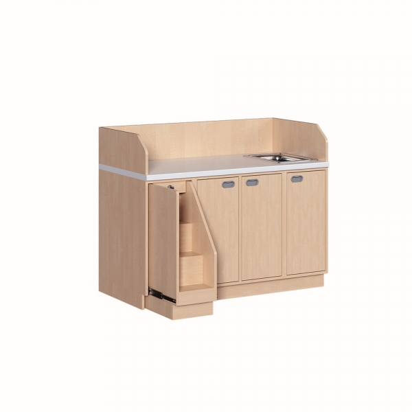 Ob als einzeln aufgestellter Wickelschrank oder als große Wickelkombination - in jedem Fall bieten die verschiedenen Elemente der Wickelkommoden langlebige Materialien, geprüfte Sicherheit, ergonomische Maße und zudem viel Stauraum. Dreiseitige Sicherheits-Aufkantungen umranden die Arbeitsplatte, welche wasserfest beschichtet und vorn benutzerfreundlich gerundet ist. Eingelassene Griffe und der zurückgesetzte Sockel gestatten ein nahes Herantreten an den Wickelplatz. Als Ausstattungen sind verschiedene Varianten rückenschonender Aufstiegshilfen, Schübe, sowie Kinderbadewannen und Handwaschbecken erhältlich. Optional ist eine besonders wasserfeste Sockelvariante lieferbar. Es kann zwischen zwei verschiedenen Arbeitstiefen und Rechts/Links-Varianten der Schränke gewählt werden. Die Wickelauflage ist separat zu bestellen.