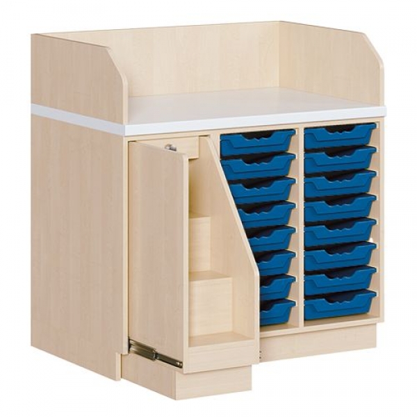 Ob als einzeln aufgestellter Wickelschrank oder als große Wickelkombination - in jedem Fall bieten die verschiedenen Elemente der Wickelkommoden langlebige Materialien, geprüfte Sicherheit, ergonomische Maße und zudem viel Stauraum. Dreiseitige Sicherheits-Aufkantungen umranden die Arbeitsplatte, welche wasserfest beschichtet und vorn benutzerfreundlich gerundet ist. Eingelassene Griffe und der zurückgesetzte Sockel gestatten ein nahes Herantreten an den Wickelplatz. Als Ausstattungen sind verschiedene Varianten rückenschonender Aufstiegshilfen, Schübe, sowie Kinderbadewannen und Handwaschbecken erhältlich. Optional ist eine besonders wasserfeste Sockelvariante lieferbar. Es kann zwischen zwei verschiedenen Arbeitstiefen und Rechts/Links-Varianten der Schränke gewählt werden. Die Wickelauflage ist separat zu bestellen.
