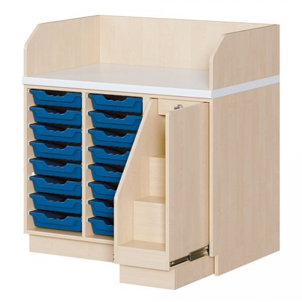 Ob als einzeln aufgestellter Wickelschrank oder als große Wickelkombination - in jedem Fall bieten die verschiedenen Elemente der Wickelkommoden langlebige Materialien, geprüfte Sicherheit, ergonomische Maße und zudem viel Stauraum. Dreiseitige Sicherheits-Aufkantungen umranden die Arbeitsplatte, welche wasserfest beschichtet und vorn benutzerfreundlich gerundet ist. Eingelassene Griffe und der zurückgesetzte Sockel gestatten ein nahes Herantreten an den Wickelplatz. Als Ausstattungen sind verschiedene Varianten rückenschonender Aufstiegshilfen, Schübe, sowie Kinderbadewannen und Handwaschbecken erhältlich. Optional ist eine besonders wasserfeste Sockelvariante lieferbar. Es kann zwischen zwei verschiedenen Arbeitstiefen und Rechts/Links-Varianten der Schränke gewählt werden. Die Wickelauflage ist separat zu bestellen.