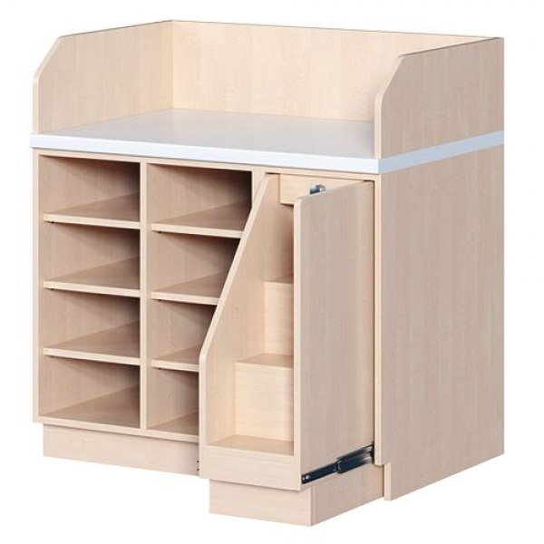 Ob als einzeln aufgestellter Wickelschrank oder als große Wickelkombination - in jedem Fall bieten die verschiedenen Elemente der Wickelkommoden langlebige Materialien, geprüfte Sicherheit, ergonomische Maße und zudem viel Stauraum. Dreiseitige Sicherheits-Aufkantungen umranden die Arbeitsplatte, welche wasserfest beschichtet und vorn benutzerfreundlich gerundet ist. Eingelassene Griffe und der zurückgesetzte Sockel gestatten ein nahes Herantreten an den Wickelplatz. Als Ausstattungen sind verschiedene Varianten rückenschonender Aufstiegshilfen, Schübe, sowie Kinderbadewannen und Handwaschbecken erhältlich. Optional ist eine besonders wasserfeste Sockelvariante lieferbar. Es kann zwischen zwei verschiedenen Arbeitstiefen und Rechts/Links-Varianten der Schränke gewählt werden. Die Wickelauflage ist separat zu bestellen.