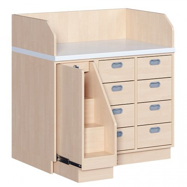 Ob als einzeln aufgestellter Wickelschrank oder als große Wickelkombination - in jedem Fall bieten die verschiedenen Elemente der Wickelkommoden langlebige Materialien, geprüfte Sicherheit, ergonomische Maße und zudem viel Stauraum. Dreiseitige Sicherheits-Aufkantungen umranden die Arbeitsplatte, welche wasserfest beschichtet und vorn benutzerfreundlich gerundet ist. Eingelassene Griffe und der zurückgesetzte Sockel gestatten ein nahes Herantreten an den Wickelplatz. Als Ausstattungen sind verschiedene Varianten rückenschonender Aufstiegshilfen, Schübe, sowie Kinderbadewannen und Handwaschbecken erhältlich. Optional ist eine besonders wasserfeste Sockelvariante lieferbar. Es kann zwischen zwei verschiedenen Arbeitstiefen und Rechts/Links-Varianten der Schränke gewählt werden. Die Wickelauflage ist separat zu bestellen.