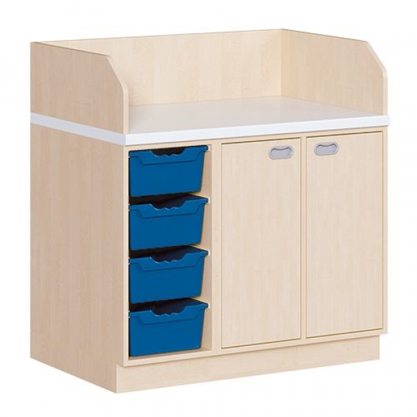 Ob als einzeln aufgestellter Wickelschrank oder als große Wickelkombination - in jedem Fall bieten die verschiedenen Elemente der Wickelkommoden langlebige Materialien, geprüfte Sicherheit, ergonomische Maße und zudem viel Stauraum. Dreiseitige Sicherheits-Aufkantungen umranden die Arbeitsplatte, welche wasserfest beschichtet und vorn benutzerfreundlich gerundet ist. Eingelassene Griffe und der zurückgesetzte Sockel gestatten ein nahes Herantreten an den Wickelplatz. Als Ausstattungen sind verschiedene Varianten rückenschonender Aufstiegshilfen, Schübe, sowie Kinderbadewannen und Handwaschbecken erhältlich. Optional ist eine besonders wasserfeste Sockelvariante lieferbar. Es kann zwischen zwei verschiedenen Arbeitstiefen und Rechts/Links-Varianten der Schränke gewählt werden. Die Wickelauflage ist separat zu bestellen.