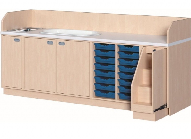 Ob als einzeln aufgestellter Wickelschrank oder als große Wickelkombination - in jedem Fall bieten die verschiedenen Elemente der Wickelkommoden langlebige Materialien, geprüfte Sicherheit, ergonomische Maße und zudem viel Stauraum. Dreiseitige Sicherheits-Aufkantungen umranden die Arbeitsplatte, welche wasserfest beschichtet und vorn benutzerfreundlich gerundet ist. Eingelassene Griffe und der zurückgesetzte Sockel gestatten ein nahes Herantreten an den Wickelplatz. Als Ausstattungen sind verschiedene Varianten rückenschonender Aufstiegshilfen, Schübe, sowie Kinderbadewannen und Handwaschbecken erhältlich. Optional ist eine besonders wasserfeste Sockelvariante lieferbar. Es kann zwischen zwei verschiedenen Arbeitstiefen und Rechts/Links-Varianten der Schränke gewählt werden. Die Wickelauflage ist separat zu bestellen.