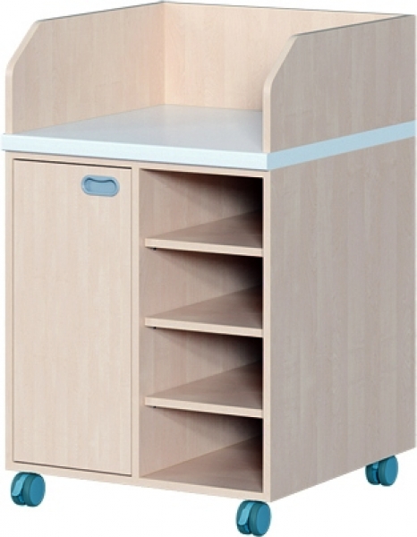 fahrbares Wickelcenter BxHxT 80,1 x 85 / 110 x 75 cm oben: 3-seitige Wickelumrandung vorne: 2 Türen, nicht abschließbar, Muschelgriffe, Mittelwand, 2 x 3 Fachböden seitlich: 1 Tür, Segmentbogengriff ( RM 128 mm ) verchromt matt 4 Rollen, 2 davon feststellbar - OHNE Wickelauflage