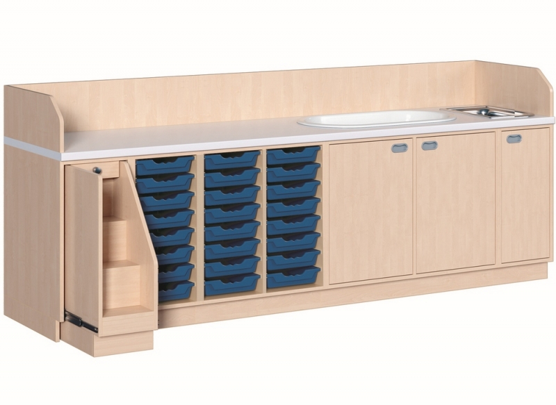 Ob als einzeln aufgestellter Wickelschrank oder als große Wickelkombination - in jedem Fall bieten die verschiedenen Elemente der Wickelkommoden langlebige Materialien, geprüfte Sicherheit, ergonomische Maße und zudem viel Stauraum. Dreiseitige Sicherheits-Aufkantungen umranden die Arbeitsplatte, welche wasserfest beschichtet und vorn benutzerfreundlich gerundet ist. Eingelassene Griffe und der zurückgesetzte Sockel gestatten ein nahes Herantreten an den Wickelplatz. Als Ausstattungen sind verschiedene Varianten rückenschonender Aufstiegshilfen, Schübe, sowie Kinderbadewannen und Handwaschbecken erhältlich. Optional ist eine besonders wasserfeste Sockelvariante lieferbar. Es kann zwischen zwei verschiedenen Arbeitstiefen und Rechts/Links-Varianten der Schränke gewählt werden. Die Wickelauflage ist separat zu bestellen.