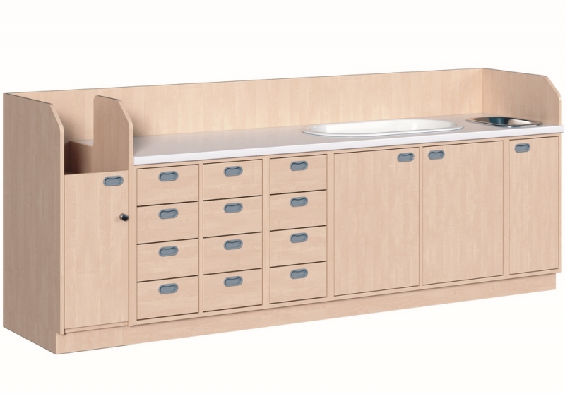 Ob als einzeln aufgestellter Wickelschrank oder als große Wickelkombination - in jedem Fall bieten die verschiedenen Elemente der Wickelkommoden langlebige Materialien, geprüfte Sicherheit, ergonomische Maße und zudem viel Stauraum. Dreiseitige Sicherheits-Aufkantungen umranden die Arbeitsplatte, welche wasserfest beschichtet und vorn benutzerfreundlich gerundet ist. Eingelassene Griffe und der zurückgesetzte Sockel gestatten ein nahes Herantreten an den Wickelplatz. Als Ausstattungen sind verschiedene Varianten rückenschonender Aufstiegshilfen, Schübe, sowie Kinderbadewannen und Handwaschbecken erhältlich. Optional ist eine besonders wasserfeste Sockelvariante lieferbar. Es kann zwischen zwei verschiedenen Arbeitstiefen und Rechts/Links-Varianten der Schränke gewählt werden. Die Wickelauflage ist separat zu bestellen.