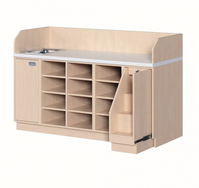 Ob als einzeln aufgestellter Wickelschrank oder als große Wickelkombination - in jedem Fall bieten die verschiedenen Elemente der Wickelkommoden langlebige Materialien, geprüfte Sicherheit, ergonomische Maße und zudem viel Stauraum. Dreiseitige Sicherheits-Aufkantungen umranden die Arbeitsplatte, welche wasserfest beschichtet und vorn benutzerfreundlich gerundet ist. Eingelassene Griffe und der zurückgesetzte Sockel gestatten ein nahes Herantreten an den Wickelplatz. Als Ausstattungen sind verschiedene Varianten rückenschonender Aufstiegshilfen, Schübe, sowie Kinderbadewannen und Handwaschbecken erhältlich. Optional ist eine besonders wasserfeste Sockelvariante lieferbar. Es kann zwischen zwei verschiedenen Arbeitstiefen und Rechts/Links-Varianten der Schränke gewählt werden. Die Wickelauflage ist separat zu bestellen.