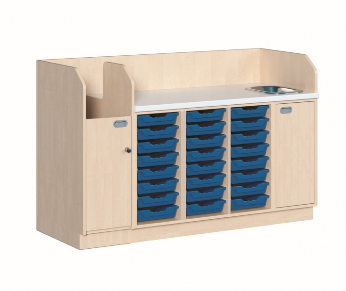 Ob als einzeln aufgestellter Wickelschrank oder als große Wickelkombination - in jedem Fall bieten die verschiedenen Elemente der Wickelkommoden langlebige Materialien, geprüfte Sicherheit, ergonomische Maße und zudem viel Stauraum. Dreiseitige Sicherheits-Aufkantungen umranden die Arbeitsplatte, welche wasserfest beschichtet und vorn benutzerfreundlich gerundet ist. Eingelassene Griffe und der zurückgesetzte Sockel gestatten ein nahes Herantreten an den Wickelplatz. Als Ausstattungen sind verschiedene Varianten rückenschonender Aufstiegshilfen, Schübe, sowie Kinderbadewannen und Handwaschbecken erhältlich. Optional ist eine besonders wasserfeste Sockelvariante lieferbar. Es kann zwischen zwei verschiedenen Arbeitstiefen und Rechts/Links-Varianten der Schränke gewählt werden. Die Wickelauflage ist separat zu bestellen.