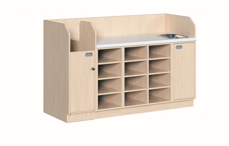 Ob als einzeln aufgestellter Wickelschrank oder als große Wickelkombination - in jedem Fall bieten die verschiedenen Elemente der Wickelkommoden langlebige Materialien, geprüfte Sicherheit, ergonomische Maße und zudem viel Stauraum. Dreiseitige Sicherheits-Aufkantungen umranden die Arbeitsplatte, welche wasserfest beschichtet und vorn benutzerfreundlich gerundet ist. Eingelassene Griffe und der zurückgesetzte Sockel gestatten ein nahes Herantreten an den Wickelplatz. Als Ausstattungen sind verschiedene Varianten rückenschonender Aufstiegshilfen, Schübe, sowie Kinderbadewannen und Handwaschbecken erhältlich. Optional ist eine besonders wasserfeste Sockelvariante lieferbar. Es kann zwischen zwei verschiedenen Arbeitstiefen und Rechts/Links-Varianten der Schränke gewählt werden. Die Wickelauflage ist separat zu bestellen.