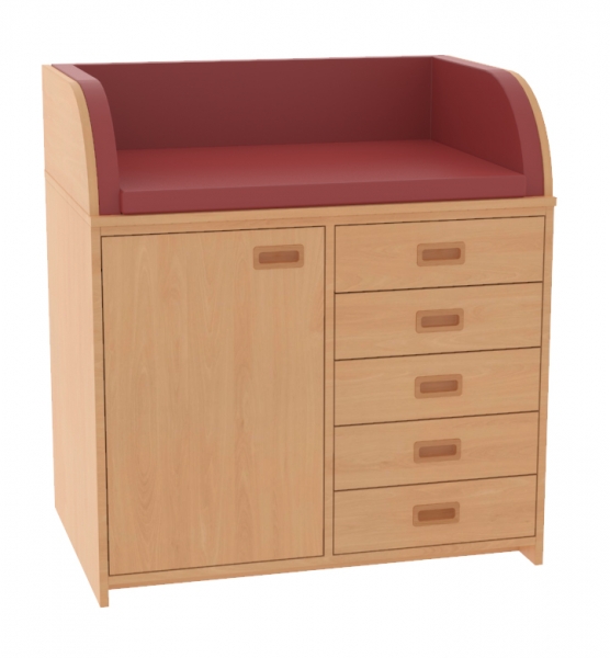 Wickelkommode BxHxT 102 x 85 / 110 x 75 cm oben: 3-seitige Aufkantung für Wickelauflage links: 1 Tür, Muschelgriff, 2 verstellbare Einlegeböden rechts: 5 Schubkästen mit SoftClose Auszügen und Muschelgriffen. Die Wickelauflage gehört nicht zum Lieferumfang, bitte als separaten Artikel in die Bestellung / Angebotsanforderung aufnehmen. Passende Wickelauflagen finden Sie unten unter der Artikelbeschreibung (bitte nach unten scrollen)!