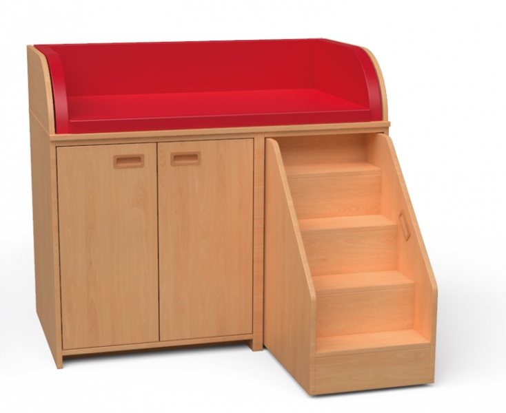 Wickelkommode, BxHxT 102 x 85 / 110 x 70 cm oben: 3-seitige Wickelumrandung unten: links: 2 Türen, nicht abschließbar, Muschelgriffe, 2 Fachböden rechts: ausfahrbare Treppe mit Feststellstopp Die Wickelauflage gehört nicht zum Lieferumfang, bitte als separaten Artikel in die Bestellung / Angebotsanforderung aufnehmen. Passende Wickelauflagen finden Sie unten unter der Artikelbeschreibung (bitte nach unten scrollen)!