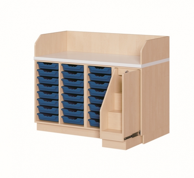 Ob als einzeln aufgestellter Wickelschrank oder als große Wickelkombination - in jedem Fall bieten die verschiedenen Elemente der Wickelkommoden langlebige Materialien, geprüfte Sicherheit, ergonomische Maße und zudem viel Stauraum. Dreiseitige Sicherheits-Aufkantungen umranden die Arbeitsplatte, welche wasserfest beschichtet und vorn benutzerfreundlich gerundet ist. Eingelassene Griffe und der zurückgesetzte Sockel gestatten ein nahes Herantreten an den Wickelplatz. Als Ausstattungen sind verschiedene Varianten rückenschonender Aufstiegshilfen, Schübe, sowie Kinderbadewannen und Handwaschbecken erhältlich. Optional ist eine besonders wasserfeste Sockelvariante lieferbar. Es kann zwischen zwei verschiedenen Arbeitstiefen und Rechts/Links-Varianten der Schränke gewählt werden. Die Wickelauflage ist separat zu bestellen.