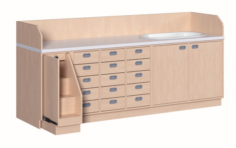 Ob als einzeln aufgestellter Wickelschrank oder als große Wickelkombination - in jedem Fall bieten die verschiedenen Elemente der Wickelkommoden langlebige Materialien, geprüfte Sicherheit, ergonomische Maße und zudem viel Stauraum. Dreiseitige Sicherheits-Aufkantungen umranden die Arbeitsplatte, welche wasserfest beschichtet und vorn benutzerfreundlich gerundet ist. Eingelassene Griffe und der zurückgesetzte Sockel gestatten ein nahes Herantreten an den Wickelplatz. Als Ausstattungen sind verschiedene Varianten rückenschonender Aufstiegshilfen, Schübe, sowie Kinderbadewannen und Handwaschbecken erhältlich. Optional ist eine besonders wasserfeste Sockelvariante lieferbar. Es kann zwischen zwei verschiedenen Arbeitstiefen und Rechts/Links-Varianten der Schränke gewählt werden. Die Wickelauflage ist separat zu bestellen.