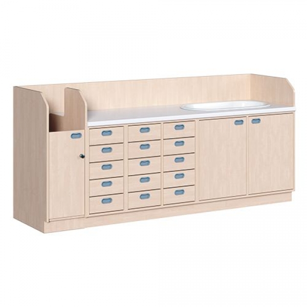 Ob als einzeln aufgestellter Wickelschrank oder als große Wickelkombination - in jedem Fall bieten die verschiedenen Elemente der Wickelkommoden langlebige Materialien, geprüfte Sicherheit, ergonomische Maße und zudem viel Stauraum. Dreiseitige Sicherheits-Aufkantungen umranden die Arbeitsplatte, welche wasserfest beschichtet und vorn benutzerfreundlich gerundet ist. Eingelassene Griffe und der zurückgesetzte Sockel gestatten ein nahes Herantreten an den Wickelplatz. Als Ausstattungen sind verschiedene Varianten rückenschonender Aufstiegshilfen, Schübe, sowie Kinderbadewannen und Handwaschbecken erhältlich. Optional ist eine besonders wasserfeste Sockelvariante lieferbar. Es kann zwischen zwei verschiedenen Arbeitstiefen und Rechts/Links-Varianten der Schränke gewählt werden. Die Wickelauflage ist separat zu bestellen.