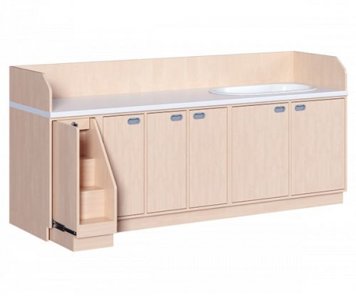 Ob als einzeln aufgestellter Wickelschrank oder als große Wickelkombination - in jedem Fall bieten die verschiedenen Elemente der Wickelkommoden langlebige Materialien, geprüfte Sicherheit, ergonomische Maße und zudem viel Stauraum. Dreiseitige Sicherheits-Aufkantungen umranden die Arbeitsplatte, welche wasserfest beschichtet und vorn benutzerfreundlich gerundet ist. Eingelassene Griffe und der zurückgesetzte Sockel gestatten ein nahes Herantreten an den Wickelplatz. Als Ausstattungen sind verschiedene Varianten rückenschonender Aufstiegshilfen, Schübe, sowie Kinderbadewannen und Handwaschbecken erhältlich. Optional ist eine besonders wasserfeste Sockelvariante lieferbar. Es kann zwischen zwei verschiedenen Arbeitstiefen und Rechts/Links-Varianten der Schränke gewählt werden. Die Wickelauflage ist separat zu bestellen.
