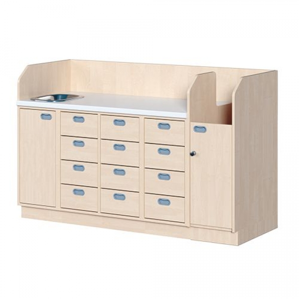 Ob als einzeln aufgestellter Wickelschrank oder als große Wickelkombination - in jedem Fall bieten die verschiedenen Elemente der Wickelkommoden langlebige Materialien, geprüfte Sicherheit, ergonomische Maße und zudem viel Stauraum. Dreiseitige Sicherheits-Aufkantungen umranden die Arbeitsplatte, welche wasserfest beschichtet und vorn benutzerfreundlich gerundet ist. Eingelassene Griffe und der zurückgesetzte Sockel gestatten ein nahes Herantreten an den Wickelplatz. Als Ausstattungen sind verschiedene Varianten rückenschonender Aufstiegshilfen, Schübe, sowie Kinderbadewannen und Handwaschbecken erhältlich. Optional ist eine besonders wasserfeste Sockelvariante lieferbar. Es kann zwischen zwei verschiedenen Arbeitstiefen und Rechts/Links-Varianten der Schränke gewählt werden. Die Wickelauflage ist separat zu bestellen.