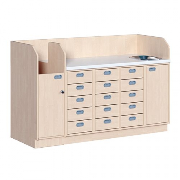 Ob als einzeln aufgestellter Wickelschrank oder als große Wickelkombination - in jedem Fall bieten die verschiedenen Elemente der Wickelkommoden langlebige Materialien, geprüfte Sicherheit, ergonomische Maße und zudem viel Stauraum. Dreiseitige Sicherheits-Aufkantungen umranden die Arbeitsplatte, welche wasserfest beschichtet und vorn benutzerfreundlich gerundet ist. Eingelassene Griffe und der zurückgesetzte Sockel gestatten ein nahes Herantreten an den Wickelplatz. Als Ausstattungen sind verschiedene Varianten rückenschonender Aufstiegshilfen, Schübe, sowie Kinderbadewannen und Handwaschbecken erhältlich. Optional ist eine besonders wasserfeste Sockelvariante lieferbar. Es kann zwischen zwei verschiedenen Arbeitstiefen und Rechts/Links-Varianten der Schränke gewählt werden. Die Wickelauflage ist separat zu bestellen.