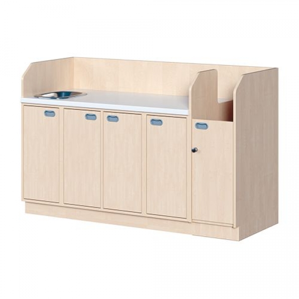 Ob als einzeln aufgestellter Wickelschrank oder als große Wickelkombination - in jedem Fall bieten die verschiedenen Elemente der Wickelkommoden langlebige Materialien, geprüfte Sicherheit, ergonomische Maße und zudem viel Stauraum. Dreiseitige Sicherheits-Aufkantungen umranden die Arbeitsplatte, welche wasserfest beschichtet und vorn benutzerfreundlich gerundet ist. Eingelassene Griffe und der zurückgesetzte Sockel gestatten ein nahes Herantreten an den Wickelplatz. Als Ausstattungen sind verschiedene Varianten rückenschonender Aufstiegshilfen, Schübe, sowie Kinderbadewannen und Handwaschbecken erhältlich. Optional ist eine besonders wasserfeste Sockelvariante lieferbar. Es kann zwischen zwei verschiedenen Arbeitstiefen und Rechts/Links-Varianten der Schränke gewählt werden. Die Wickelauflage ist separat zu bestellen.