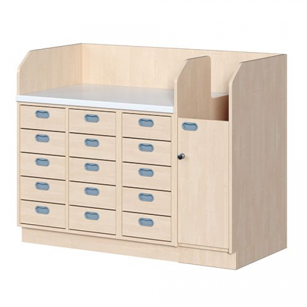 Ob als einzeln aufgestellter Wickelschrank oder als große Wickelkombination - in jedem Fall bieten die verschiedenen Elemente der Wickelkommoden langlebige Materialien, geprüfte Sicherheit, ergonomische Maße und zudem viel Stauraum. Dreiseitige Sicherheits-Aufkantungen umranden die Arbeitsplatte, welche wasserfest beschichtet und vorn benutzerfreundlich gerundet ist. Eingelassene Griffe und der zurückgesetzte Sockel gestatten ein nahes Herantreten an den Wickelplatz. Als Ausstattungen sind verschiedene Varianten rückenschonender Aufstiegshilfen, Schübe, sowie Kinderbadewannen und Handwaschbecken erhältlich. Optional ist eine besonders wasserfeste Sockelvariante lieferbar. Es kann zwischen zwei verschiedenen Arbeitstiefen und Rechts/Links-Varianten der Schränke gewählt werden. Die Wickelauflage ist separat zu bestellen.