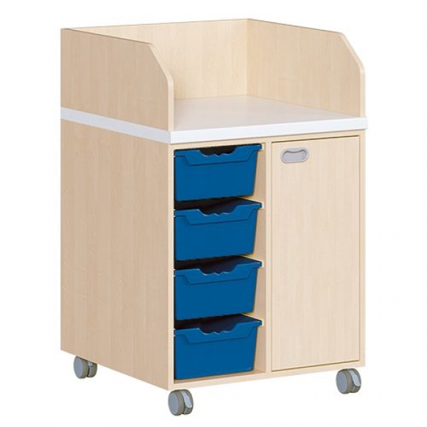 Neben der flexiblen Einsetzbarkeit, zeichnen sich die fahrbaren Wickelkommoden zudem durch langlebige Materialien, geprüfte Sicherheit, ergonomische Maße und viel Stauraum aus. Dreiseitige Sicherheits-Aufkantungen umranden die Arbeitsplatte, welche wasserfest beschichtet und vorn benutzerfreundlich gerundet ist. Eingelassene Griffe und hohe Rollen gestatten ein nahes Herantreten an die Kommode. Als Ausstattungen sind Schübe, Türen und Regale erhältlich. Es kann zwischen verschiedenen Arbeitstiefen und Rechts/Links-Varianten gewählt werden. Die Wickelauflage ist separat zu bestellen.