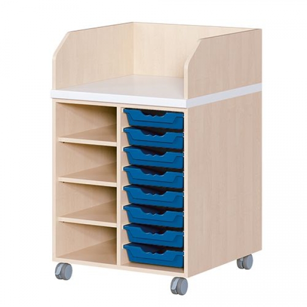 Neben der flexiblen Einsetzbarkeit, zeichnen sich die fahrbaren Wickelkommoden zudem durch langlebige Materialien, geprüfte Sicherheit, ergonomische Maße und viel Stauraum aus. Dreiseitige Sicherheits-Aufkantungen umranden die Arbeitsplatte, welche wasserfest beschichtet und vorn benutzerfreundlich gerundet ist. Eingelassene Griffe und hohe Rollen gestatten ein nahes Herantreten an die Kommode. Als Ausstattungen sind Schübe, Türen und Regale erhältlich. Es kann zwischen verschiedenen Arbeitstiefen und Rechts/Links-Varianten gewählt werden. Die Wickelauflage ist separat zu bestellen.