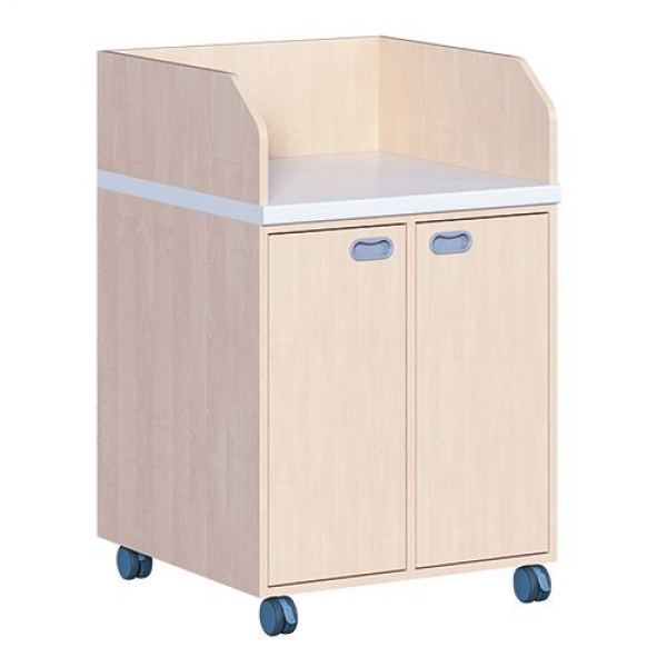 Neben der flexiblen Einsetzbarkeit zeichnen sich die fahrbare Wickelkommode durch die feuerhemmendes Material, langlebige Materialien, geprüfte Sicherheit, ergonomische Maße und viel Stauraum aus. Dreiseitige Sicherheits-Aufkantungen umranden die Arbeitsplatte, welche im Korpusdekor ausgeführt ist (abweichendes Bild!) und vorn eine ABS-Kante besitzt. Eingelassene Griffe und hohe Rollen gestatten ein nahes Herantreten an die Kommode. In der B1-Ausführung sind als Ausstattung Türen erhältlich. Die Wickelauflage ist separat zu bestellen.