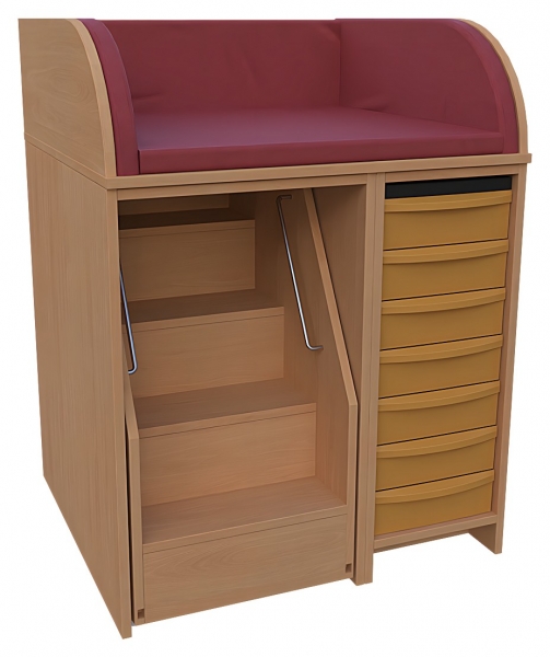 Wickelkommode, BxHxT 83 x 85 / 110 x 75 cmoben: 3-seitige Aufkantung für Wickelauflage- Kunstleder Wickelauflage nicht im Lieferumfang enthaltenrechts: 7 flache Modulboxenlinks: 1 ausfahrbare Treppe mit Feststellstop
