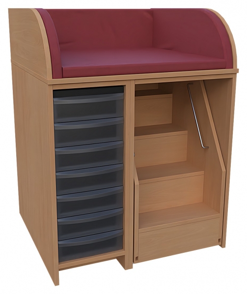 Wickelkommode, BxHxT 83 x 85 / 110 x 75 cmoben: 3-seitige Aufkantung für Wickelauflage- Kunstleder Wickelauflage nicht im Lieferumfang enthaltenlinks: 7 flache Modulboxenrechts: 1 ausfahrbare Treppe mit Feststellstop