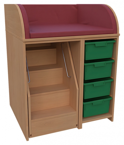 Wickelkommode, BxHxT 86 x 85 / 110 x 75 cmoben: 3-seitige Aufkantung für Wickelauflage- Kunstleder Wickelauflage nicht im Lieferumfang enthaltenrechts: offen, 4 hohe Kunststoffkästenauf Kunststoffschienen laufendlinks: 1 ausfahrbare Treppe mit Feststellstop