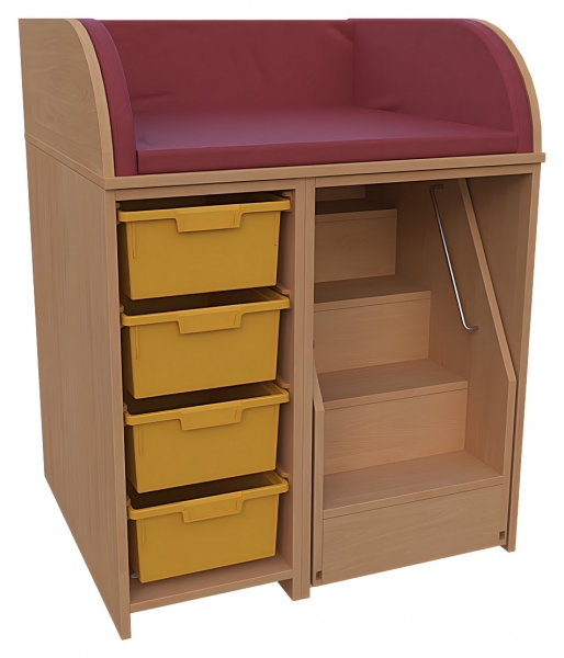 Wickelkommode, BxHxT 86 x 85 / 110 x 75 cmoben: 3-seitige Aufkantung für Wickelauflage- Kunstleder Wickelauflage nicht im Lieferumfang enthaltenlinks: offen, 4 hohe Kunststoffkästenauf Kunststoffschienen laufendrechts: 1 ausfahrbare Treppe mit Feststellstop