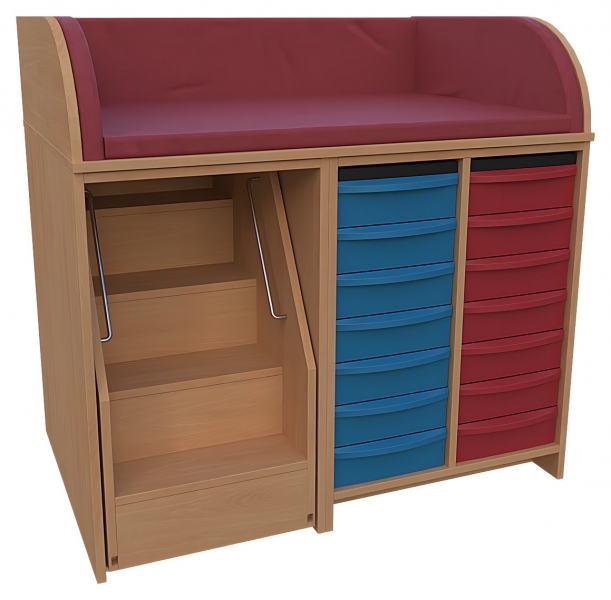 Wickelkommode, BxHxT 114 x 85 / 110 x 75 cmoben: 3-seitige Aufkantung für Wickelauflage- Kunstleder Wickelauflage nicht im Lieferumfang enthaltenrechts: offen,Mittelwand,2 x 7 flache Modulboxenlinks: 1 ausfahrbare Treppe mit Feststellstop