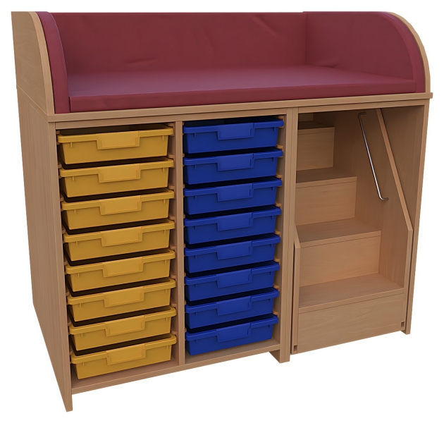Wickelkommode, BxHxT 120 x 85 / 110 x 75 cmoben: 3-seitige Aufkantung für Wickelauflage- Kunstleder Wickelauflage nicht im Lieferumfang enthaltenlinks: offen, Mittelwand, 2 x 8 flachen Kunststoffkästenauf Kunststoffschienen laufend rechts: 1 ausfahrbare Treppe mit Feststellstop