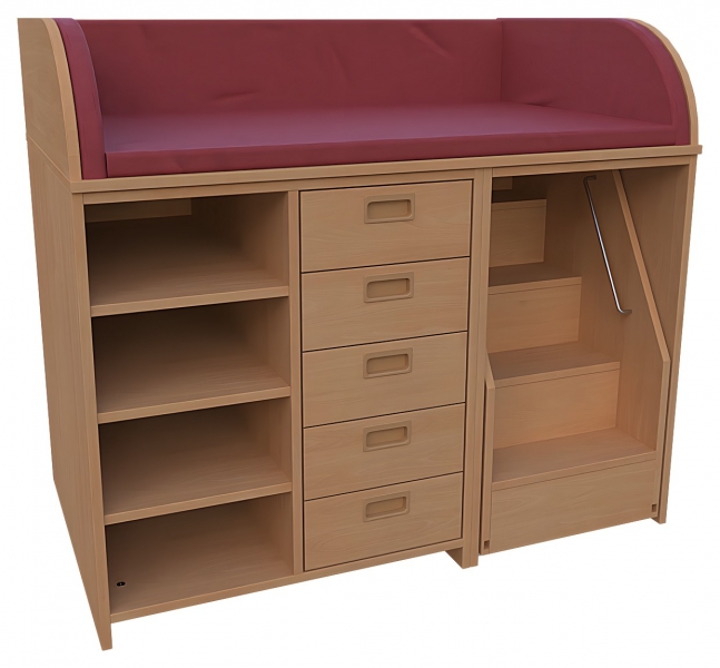 Wickelkommode, BxHxT 125 x 85 / 110 x 75 cmoben: 3-seitige Aufkantung für Wickelauflage- Kunstleder Wickelauflage nicht im Lieferumfang enthaltenlinks: offen, Mittelwand, 5 Schubkästenmit SoftClode Auszügen, Muschelgriffendaneben, offen, 3 verstellbare Einlegebödenrechts: 1 ausfahrbare Treppe mit Feststellstop