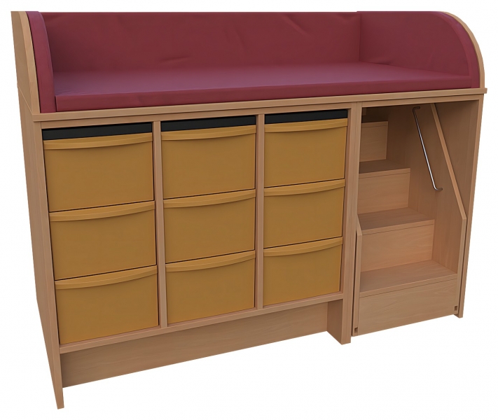Wickelkommode, BxHxT 145 x 85 / 110 x 75 cmoben: 3-seitige Aufkantung für Wickelauflage- Kunstleder Wickelauflage nicht im Lieferumfang enthaltenlinks: offen, 2 Trennwände, 3 x 3 hohen Modulboxenrechts: 1 ausfahrbare Treppe mit Feststellstop