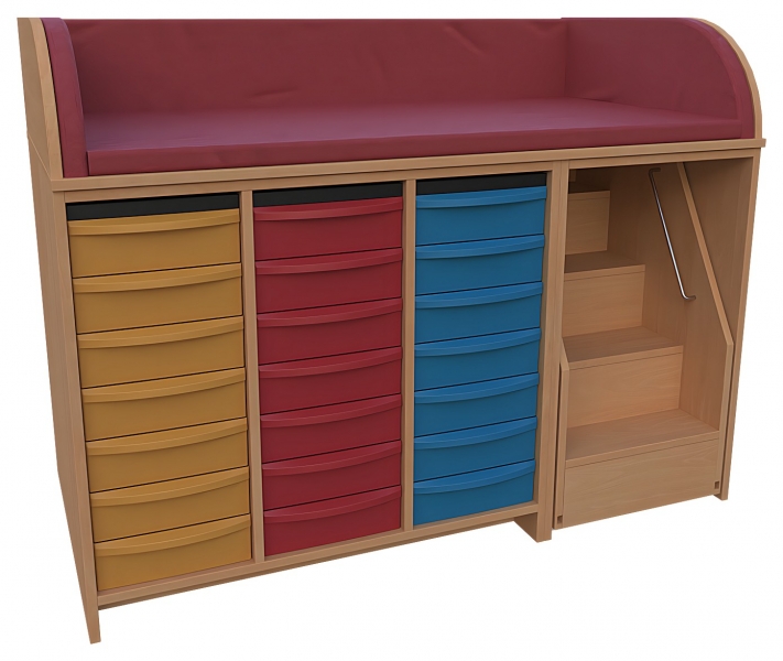 Wickelkommode, BxHxT 145 x 85 / 110 x 75 cmoben: 3-seitige Aufkantung für Wickelauflage- Kunstleder Wickelauflage nicht im Lieferumfang enthaltenlinks: offen, 2 Trennwände, 3 x 7 flache Modulboxenrechts: 1 ausfahrbare Treppe mit Feststellstop