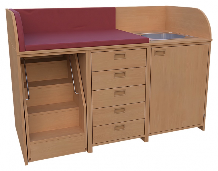 Wickelkommode, BxHxT 160 x 85 / 110 x 75 cmoben: 3-seitige Aufkantung für Wickelauflage- Kunstleder Wickelauflage nicht im Lieferumfang enthaltenrechts:: 1 Waschbecken, 1 Tür, Muschelgrff, 1 Einlegebodenmitte: 5 Schubkästen, Muschelgriffe, SoftClose Auszügelinks: 1 ausfahrbare Treppe mit Feststellstop