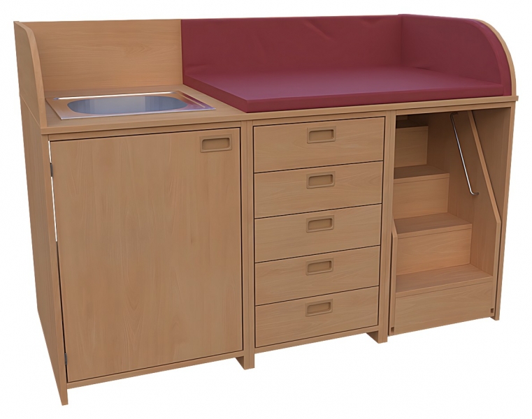 Wickelkommode, BxHxT 160 x 85 / 110 x 75 cmoben: 3-seitige Aufkantung für Wickelauflage- Kunstleder Wickelauflage nicht im Lieferumfang enthaltenlinks:: 1 Waschbecken, 1 Tür, Muschelgrff, 1 Einlegebodenmitte: 5 Schubkästen, Muschelgriffe, SoftClose Auszügerechts: 1 ausfahrbare Treppe mit Feststellstop